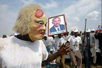 A supporter of Paul Kagame and the RPF wears a mask as he dances in front of a portrait of Kagame, Aug 23, 2003 during the campaigning at the Stage Regional de Kigali stadium in the Rwandan capital, Kigali.   [AP]