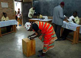 A Rwandan woman casts her vote in the country's first multi-party elections since the 1994 genocide at a polling station in Kigali, Rwanda August 25, 2003.   [Reuters]
