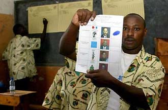 A Rwandan electoral official shows a ballot paper after counting began in the country's first election since the 1994 genocide, Kigali, Rwanda August 25, 2003.   [Reuters]