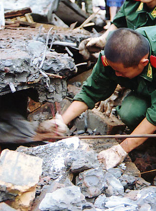 An armed police officer continue the search for survivors amid debris in Ya'an, in Southwest China's Sichuan Province Wednesday August 27, 2003. A torrential storm caused landslides there as around 230 millimetres of rain fell in five hours late on Monday and early on Tuesday. By Wednesday, at least 18 deaths had been reported, with three others still missing. [newsphoto.com.cn]