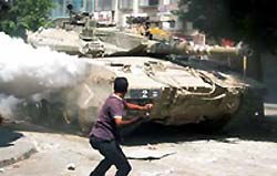 A Palestinian youth throws stones at an Israeli tank during clashes in the West Bank city of Jenin August 27, 2003.   [Reuters]