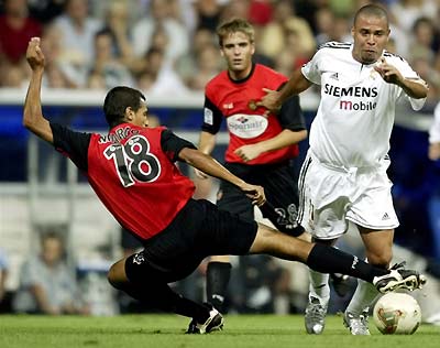 Mallorca's Marcos Martin tackles Real Madrid's Brazilian player Ronaldo (R) during their Spanish Super Cup second leg soccer match at Santiago Bernabeu stadium August 27, 2003. [Reuters]