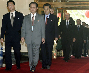 Kim Yong-il, North Korea's Deputy Foreign Minister, (2-L) lead other heads of delegations to a meeting with Chinese State Councillor Tang Jiaxuan in Beijing August 29, 2003. The six-party talks concluded in Beijing Friday, with all agreed to meet again within months. [Reuters]
