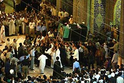 Halfway along the route, at Karbala, the second-holiest Shiite city after Najaf, 3,000 mourners gathered at a shrine to await the procession. They prayed, beating drums and flagellated themselves with chains as the ayatollah's coffin and the huge procession neared. His funeral is planned for Tuesday in Najaf, his birthplace.