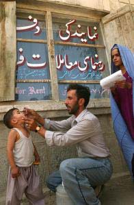 Afghan doctor Nazar Mohammad, center, 32, vaccinates Ayoub, left,4, against polio while doctor Nahida, 20, looks on in a street in Kabul, Afghanistan, Sept 3, 2003. UNICEF started on Tuesday a three day program to immunize six million children against polio in Afghanistan. At the window it reads 'Representative of Propeties Dealing Shop.'    [AP]
