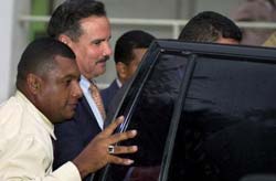 Pedro Remon Rodriguez (2nd L) is escorted to a car from the Maritime Tribunal after the first day of a preliminary hearing for four Cuban-Americans in Panama City, Panama Sept 3, 2003.   [AP]