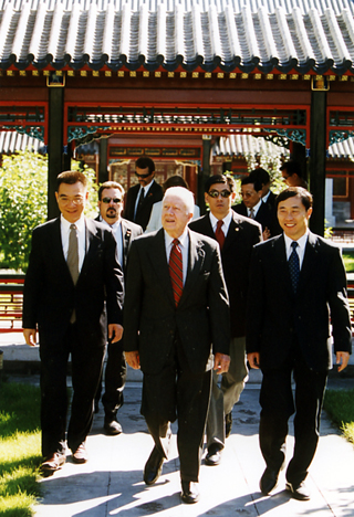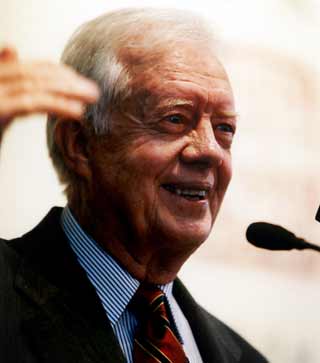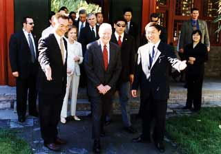 Former US President Jimmy Carter delivers a speech on China's progress in building democracy as he visited Peking University September 9, 2003. [newsphoto.com.cn]