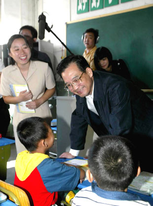 | | Premier Wen Jiabao talks to a student in an elementary school in Beijing's Shijingshan District on September 9, 2003. The premier extended his warm regards to teachers there just ahead of the Teachers' Day, which falls on September 10, 2003. Wen said the State Council has set a five-year goal of enabling the vast majority of school-age children to have nine years of compulsory education by 2007. [Xinhua] |