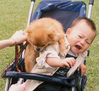 An infant shares his pram with the family's pet dog on an outing in a local park. [newsphoto.com.cn]