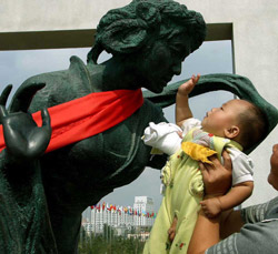 A local Changchun woman raises her baby to the face of a sculpture at the Changchun World Sculpture Park, located on the outskirts of Changchun, capital of Northeast China's Jilin Province. [China Daily]