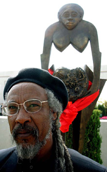Getachew Yossef Hagoss from Ethiopia stands in front of his sculpture of an African woman with an exaggerated image of a womb cast in bronze.
