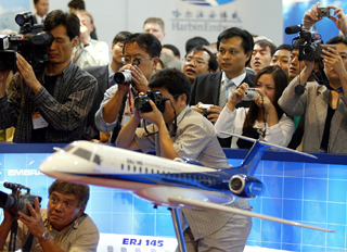 The ERJ145 produced by Harbin Embraer Aircraft Industry Co Ltd attacts media attention at the International air show in Beijing September 17, 2003. About 158 avation companies and related firms from 21 countries and regions are at the four-dya air show, which ends on September 20. [newsphoto.com.cn]