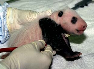 the San Diego Zoo, applies a stethoscope to the zoo's three-week-old panda
