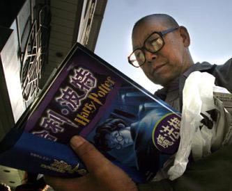 | An elderly Chinese man looks at the contents of a package containing 'Harry Potter (news - web sites) and the Order of the Phoenix' book and gameset during the launch of the Chinese version of the latest Harry Potter book in Beijing, China, Sunday, Sep 21, 2003. The gameset based on the characters in the book were given out free with every purchase of the 'Harry Potter and the Order of the Phoenix' [AP]