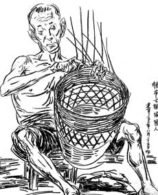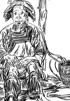 The walk was so relaxing that I could not help but crying out: "Hey..." just like the Miao people singing a folk song. Unexpectedly, we heard "crow, crow, crow" from the other side of river. It was a rooster. My son and I looked at each other and then burst into laughter. There were some booths selling tea and fruit on the way. Most of the sellers were elderly people. I asked one of them to be my model. He agreed, but insisted I must buy his pears in return. The old man was a good model. He sat there quietly until I completed my painting. Thus I managed to draw sketches of a few other dealers. But my son was worn out from carrying a large bag of fruit I had bought along the way. We stopped to take a rest at a tea booth where I completed my last sketch. "That would be the end of our trip!" I told myself. I went down to the brook and soaked my feet in the clear and cool water. There were many crabs on the rock. I lay down on the river bank, stretching my tired limbs and savouring the last moments of our trip.
