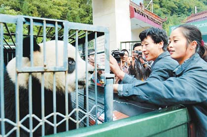 New home opens to pandas ( 2003-09-22 10:05) (Xinhua) Eight giant pandas in the Wolong breeding reserve in Sichuan Province were Sunday relocated to a new habitat built to prevent the spread of disease and inbreeding. After a carefully-planned six-hour journey, the animals arrived at the Bifengxia Giant Panda World in YaˇŻan at 2 p.m., 200km from the Wolong reserve.