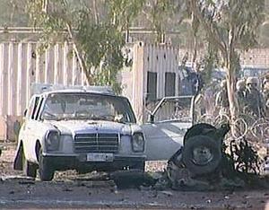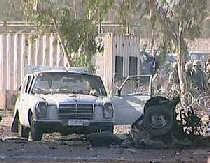 Wreckage from a car bomb that exploded while being examined at a checkpoint near the U.N. compound at the Canal Hotel in Baghdad, Iraq Sept. 22, 2003, is shown in this image from television. At least two people were killed in the explosion. [AP]