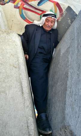 An elderly Palestinian man scrambles over an Israeli wall dividing the West Bank town of Abu Dis from East Jerusalem September 23, 2003. [Reuters]