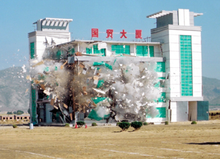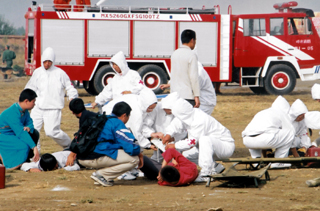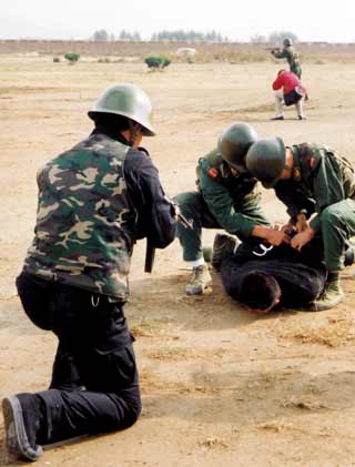A `prime suspect' is caught during the first anti-terrorism exercise of the Inner Mongolia Autonomous Region, held in the capital city of Hohhot September 23, 2003. About 3,000 police, soldiers and representatives from the healthcare and civil aviation sectors joined the exercise. [newsphoto.com.cn]
