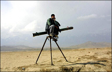 An Afghan soldier sits on a rocket launcher placed at a check point on a road. Dozens of suspected Taliban were beseiged in a religious school by Afghan troops in an eastern border region at the center of an apparent resurgence by the militia. [AFP]