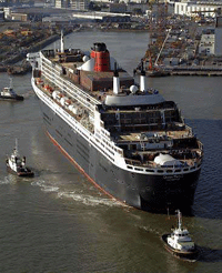 The world's largest, longest, and tallest transatlantic liner Queen Mary II leaves its dock at the Alstom shipyards in St Nazaire, western France, Sept.25, 2003 for a three-day engine test in the Atlantic ocean. The ship is scheduled to embark on her maiden voyage in Jan. 2004 for a 15-day cruise from Southampton, England to Fort Lauderdale, Florida. [Reuters]