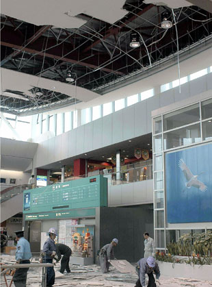 Workers clear debris at Kushiro Airport terminal on the northern main island of Hokkaido, Japan after it was shaken by powerful earthquakes September 26, 2003. A series of earthquakes jolted Hokkaido early on Friday, injuring more than 230 people, causing widespread damage and blackouts and prompting officials to issue tidal wave warnings. [Reuters]