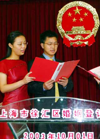 Bride Shen Jialing and her husband He Jiabin receive their marriage certificate in Shanghai after becoming the first couple in Xuhui District to be wed under the new national marriage registry regulation, which took effect October 1, 2003. [newsphoto.com.cn]