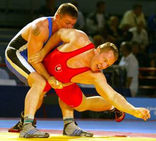 Germany's Mirko English (L) and Slovak Roman Meduna (R) in action during the 96kg qualifying session of the Greco-Roman wrestling World Championships at Robert Oubron sport hall in Creteil, October 3, 2003. [Reuters]