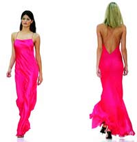 Ralph Lauren, mixed candy-like tones of peach, fuchsia, lilac and kiwi green in a sporty line of halter dresses, short skirts with kicky pleats and sleek gowns inspired by the look of V-neck cable tennis sweaters.