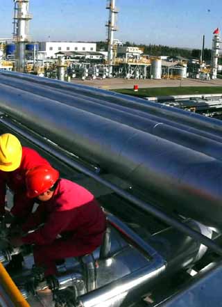 | | Workers on the Changqing Gas Field in Northwest China's Shaanxi Province inspected the system of the nation's west east gas pipeline project Monday, October 6, 2003. The pipeline originates from that field. Tuesday, Shanghai received the first natural gas supply transferred via the billion-dollar project. [newsphoto.com.cn] |