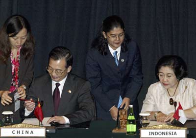 Chinese Premier Wen Jiabao (2nd L) and Indonesian President Megawati Sukarnoputri (R) sign an agreement in Nusa Dua, Bali October 8, 2003. Chinese Premier Wen Jiabao and ASEAN leaders signed agreements to foster trust. [Reuters]