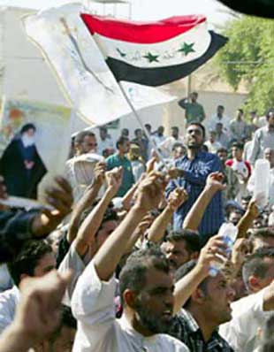 A Shi'ite Muslim protester waves an Iraqi flag October 8, 2003 after thousands marched to the Baghdad headquarters of the U.S. led administration in Iraq. More than 2,000 Shi'ite Muslims marched to the headquarters of the U.S.-led administration in a second day of protests demanding the release of a cleric arrested by American troops.  [Reuters]