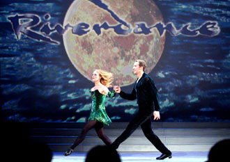| | Joanne Doyle and Conor Hayes at a rehearsal of the Irish dance show Riverdance, which was held in the afternoon on Oct 9, 2003 at Beijing's Great Hall of the People. The show had its Chinese debut in the hall last night, and performances will continue each evening until Tuesday. [China Daily] |