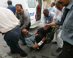Lying in a hospital bed in a bloodstained vest and shorts, hotel guard Ali Adel said he had opened fire on the car as it sped toward the hotel. "I took two shots at it and then it blew up," he said. Iraqi police chief Ahmad Ibrahim said he suspected supporters of ousted president Saddam Hussein or guerrillas of the militant Islamist al Qaeda group. "They thought if they did this the Americans would be afraid and leave Iraq." ROADSIDE BOMBS Attacks on U.S. troops in Iraq have killed 94 soldiers since Washington declared major combat over on May 1. Bombs have targeted the United Nations, the Jordanian embassy and a hotel used by U.S. media. Iraqis seen as cooperating with the U.S.-led administration have also been targeted. Earlier on Sunday, a roadside bomb struck a convoy of three civilian vehicles in central Baghdad, injuring five Iraqis, including a Shi'ite cleric, witnesses said. When U.S. forces sealed off the area, a crowd gathered and an Iraqi teenager lobbed an explosive at a U.S. Humvee armored vehicle. One U.S. soldier was slightly injured. Another roadside bomb exploded outside a U.S. base in Saddam's home town of Tikrit on Sunday wounding three soldiers, one seriously, an Army spokesman said. Washington is pushing for a new Security Council resolution giving the United Nations a broader mandate to try to persuade reluctant countries to help in stabilizing Iraq. Secretary-General Kofi Annan has said the United Nations cannot play a political role in Iraq under the terms envisaged in the current draft U.S. resolution. France and Russia have said the draft should include a road map for a faster handover of power to a sovereign Iraqi government. "We are still waiting to see the new draft resolution," French President Jacques Chirac told reporters on Sunday after talks with German Chancellor Gerhard Schroeder. "We hope that a new dynamic will appear in the new resolution that will better reflect our requirements," Schroeder added. Turkey has agreed to send troops, but Iraq's Governing Council, handpicked by Washington, is resisting the move, saying neighboring countries have too many of their own strategic interests in Iraq to be peacekeepers. Annan has agonized over staff safety in Iraq since an August 19 suicide bomb attack on the U.N. headquarters in Baghdad killed 22 people and a second bomb attack on the compound last month killed an Iraqi policeman and wounded 19.