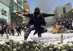 A demonstrator jumps over a barricade in La Paz, October 13, 2003.  [Reuters]