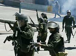 Bolivian riot police shoot teargas during a strike in the center of La Paz, October 13, 2003.   [Reuters]