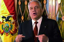 Bolivian president Gonzalo Sanchez de Lozada delivers a speech to the nation due to the severe social conflicts that reached the country in La Paz, Bolivia on monday, October 13, 2003.  [AP]