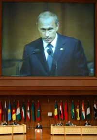 The U.N. Security Council is due to vote on the resolution later on Thursday. The European powers have suggested amendments. Iraq and the Israel-Palestinian conflict are the Islamic world's two biggest issues, but the 57-member Organization of the Islamic Conference (OIC) struggles to have influence on either. The president of Iraq's U.S.-backed governing council has sent a clear message to fellow Muslim states at the OIC that their interference would not be appreciated. And Mahathir, soon to retire and making his valedictory appearance at an OIC summit, declared that over 50 years of fighting had accomplished nothing for the Palestinians while the Jewish people enjoyed the influence of a world power. But he said faith could lead Muslims to victory at the negotiating table. "The Koran tells us that when the enemy sues for peace we must react positively," he told the summiteers, adding that his words would not be popular. "True the treaty offered to us is not favorable. But we can negotiate. The Prophet did," he said. "And in the end he triumphed." Two kings, two sheikhs, a prince and a sultan were among some 30 heads of state and government attending the largest assembly of Muslim leaders since Muslim radicals attacked the United States in September 2001. The meeting, being held in Malaysia's new administrative capital, Putrajaya, is scheduled to end on Friday. Just a few years old, the road from Putrajaya's palaces, lakes and mosques to the space age conference center on its outskirts is still unfinished and palm trees lining the avenue were planted days before the summit opened. IRAQI COUNCIL ACTS TOUGH Putin and Philippines President Gloria Macapagal Arroyo, who both have large, rebellious Muslim minorities, were guests. Resolutions drawn up by foreign ministers ahead of the summit, condemning Israel's military incursions in the Palestinian territories and its air strike on Syria earlier this month are expected to be passed. But Iraq's U.S.-backed Provisional Governing Council asked the OIC to hold in abeyance another motion calling for the United Nations to take a central role in the reconstruction of Iraq and for the U.S.-led occupying forces to quit as soon as possible. "We made the request this morning. They will surely pull it out," Nbhan Salih, a member of the Iraqi delegation, told Reuters. The council wants first to see the U.N. Security Council pass a U.S. resolution which would transform the council's role into the interim authority in Iraq, embodying the state, and give the occupying forces a U.N. mandate. The OIC allowed the Provisional Governing Council to represent the occupied country in the absence of a government, and its president sent a clear message to fellow Muslim states that, while their advice and help would be appreciated, their interference would not. "We are willing to listen to advice but we do not accept from anyone else other than Iraqis to have imposed on us the nature of timetabling the next agenda for Iraq," said Iyad Allawi, who took over the council presidency under the rotating leadership earlier this month, on the eve of the summit. Palestinian President Yasser Arafat was unable to come to Malaysia because of the splits in the leadership and an Israeli policy to have him exiled, deported or eliminated.