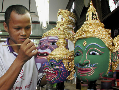 | | |  | | | Mask maker Sorapong Pongsuk put finishing touches to masks worn at tradtional Thai dance in Ayutthaya, 80 km (50 miles) north of Bangkok, October 16, 2003. These masks will be presented as part of the official gifts to leaders of the 21-member Asia-Pacific Economic Cooperation (APEC) during their meeting in the Thai capital. Picture taken October 16, 2003. [Reuters] | | | | | | | | | |