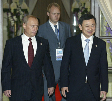 Russian President Vladimir Putin (L) is led by Thai Prime Minister Thaksin Shinawatra (R) to a conference room at the Goverment House in Bangkok October 20, 2003 to attend the summit meeting of the Asia-Pacific Economic Cooperation (APEC). An unidentified official is seen in the centre.[Reuters]