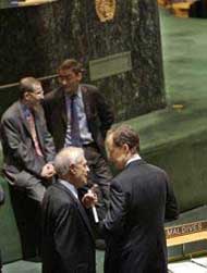League of Arab States permanent ambassador to the UN Yahya Mahmassani (L) talks to US deputy ambassador James Cunningham, below, before a vote during the tenth emergency special session of the UN  assembly on illegal Israeli actions in occupied East Jerusalem and the rest of the occupied Palestinian territory Oct. 21, 2003, at U.N. in New York. [AP]