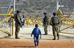 Israeli soldiers open a gate in a security fence, built by Israel to separate Israel from the West Bank, for a Palestinian boy returning from school to his village near the West Bank city of Tulkarm Oct. 21, 2003. A top U.N. official said that Israel had accelerated construction of a barrier across Palestinian land in recent weeks and urged it to halt the project and tear down the 90-mile section already built.   [Reuters]