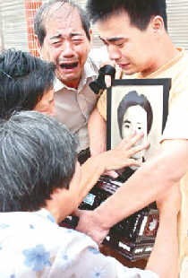 Relatives cry over a framed photo of Sun Zhigang, whose death triggered the abolition of China's repatriation regulation on the homeless. [newsphoto.com.cn/file]