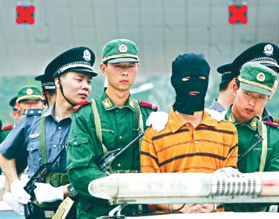Unidentified suspects in a robbery and kidnap case are paraded in public after their capture in Lishui, east China's Zhejiang Province. Public sentiment sometimes plays a role in verdicts. [China Daily HK Edition]