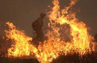 works the front face of the Cedar fire outside Julian, Calif., Tuesday,