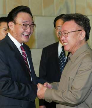 Top legislator Wu Bangguo is greeted by Kim Jong-il, general secretary of the Central Committee of the Workers' Party of Korea, in Pyongyang October 30, 2003. Wu is on an official goodwill visit to the Democratic People's Republic of Korea (DPRK) to push for a nuclear-free Korean Peninsula. The DPRK leader agreed in principle to continue the process of six-party talks on the simmering nuclear issue. [Xinhua]
