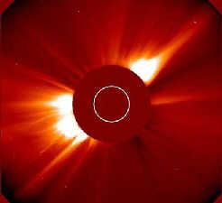 Solar activity is shown in an image made October 24, 2003 by the LASCO C3 instrument onboard the SOHO spacecraft. The Earth's magnetic field was bombarded with extra energy from the Sun on Oct. 24 when a geomagnetic storm sent charged particles that affected electric utilities, airline communications and satellite navigation systems. [NASA]
