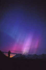 This image photographed at 6:30 AM Alaska Standard Time, October 29, 2003 shows aurora near Eureka, Alaska over the Chugach mountains, about 110 miles northeast of Anchorage. The orange in the photo is not aurora, but the sunrise. The twilight affects the color of the aurora, giving them more of a pastel color, and also shifted the common green aurora to a light blue. A second huge magnetic solar storm hit Earth October 30, just a day after an earlier one hurtled into the planet in what one astronomer called an unprecedented one-two punch. [Reuters]