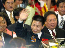 Yang Liwei (C), China's first astronaut, waves to Hong Kong people welcoming him at the airport as he arrived there on Friday for a six-day visit. Yang was greeted by top government officials and scores of flag-waving schoolchildren at the airport before being whisked off to a dinner reception, hosted by leader Tung Chee-hwa.[newsphoto.com.cn]