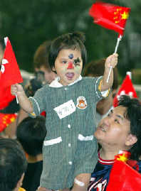 A schoolgirl waves China's national flag and the flag of Hong Kong SAR as China's first taikonaut Yang Liwei arrives at the Hong Kong airport, Oct 31, 2003. [newsphoto.com.cn]